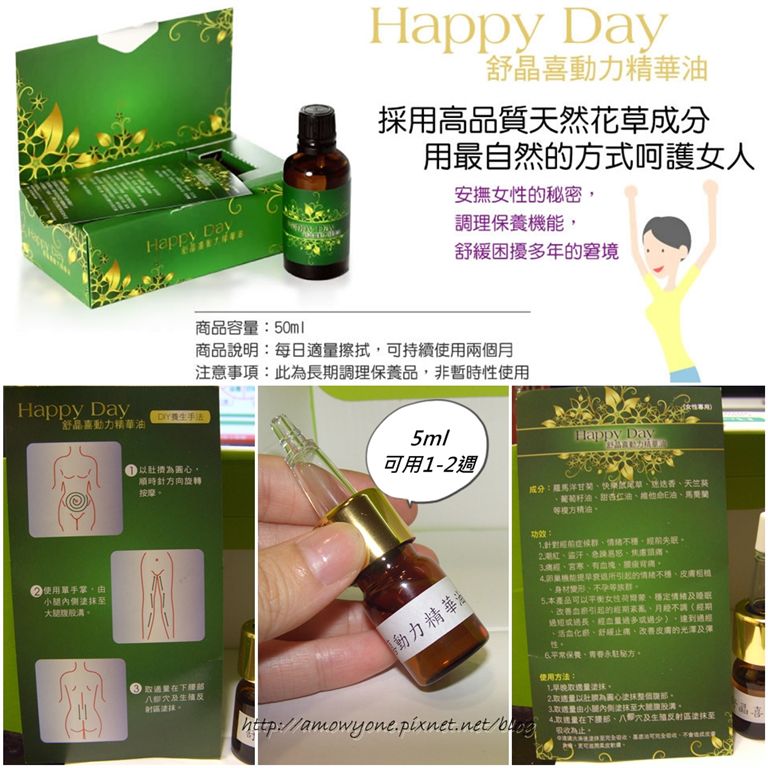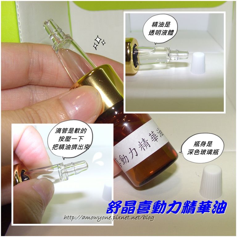 以前很喜歡在生理期的時候,就有藉口請假了。 但是現在工作久了,遇到生理期反而很討厭阿,有時候會病懨懨,想回家又沒力氣,想請假又沒勇氣...好兩難喔!!! 想到有幾次經痛,痛的我必須彎腰抱腹,跑到休息室窩一下,腦袋已經像發燒一樣,根本沒辦法思考啦!! 後來在生理期快來前幾天,會吃點液態鈣膠囊,或是在生理期第一天,讓肚子盡量保暖,減少經痛不舒服的感覺。 我想,讓身體經絡可以活血,不要著涼,應該可以幫助舒緩經痛吧!! 這一次很幸運拿到 「舒晶喜動力精華油」 ,收到的時候剛好生理期剛來一兩天,肚子還是會悶悶的,身體很躁熱。 剛好可以試試看舒緩效果。